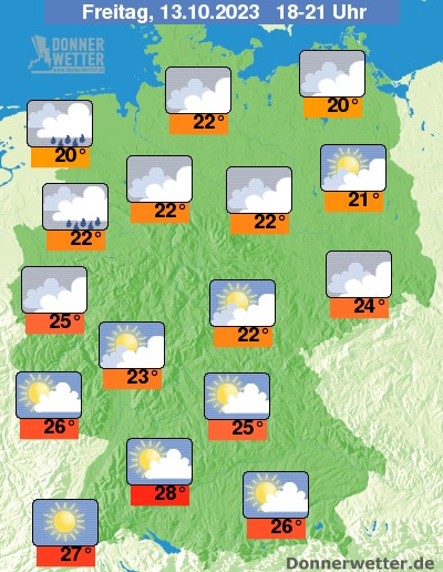 Heute Abend zieht von Nordwesten neuer Regen auf, der sich im Verlauf auch bis auf den Norden und Westen hin ausbreitet. Über dem Süden bleibt es verbreitet heiter bis sonnig und trocken. Im Osten ist es oft aufgelockert, teils auch stark bewölkt und ebenso trocken. Die Temperatur liegt bei 20 Grad an der See und sehr warmen 28 Grad im Raum Stuttgart. Im Norden weht ein teils stürmischer Wind, an den Küsten herrscht verbreitet Sturm!