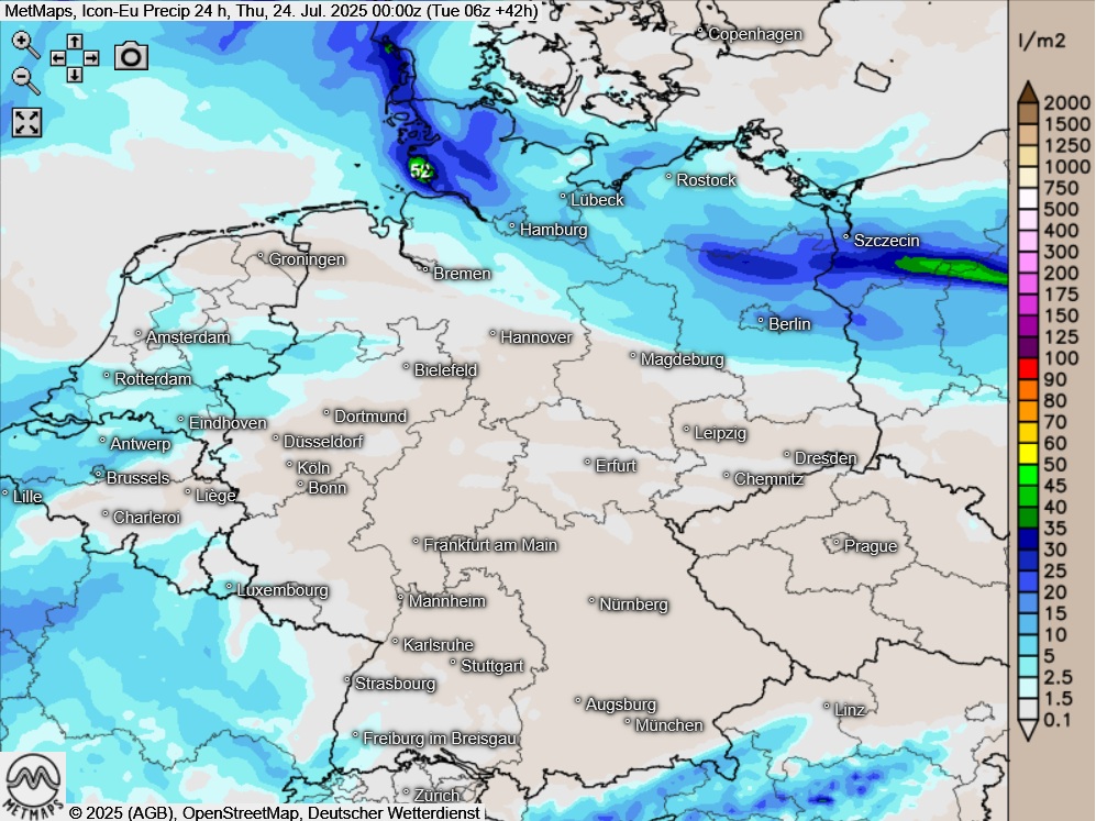 Die Karten bilden die akkumulierten 24-Stunden-Regenmengen am Mittwoch für die gesamte Bundesrepublik und im Detail Schleswig-Holstein ab.