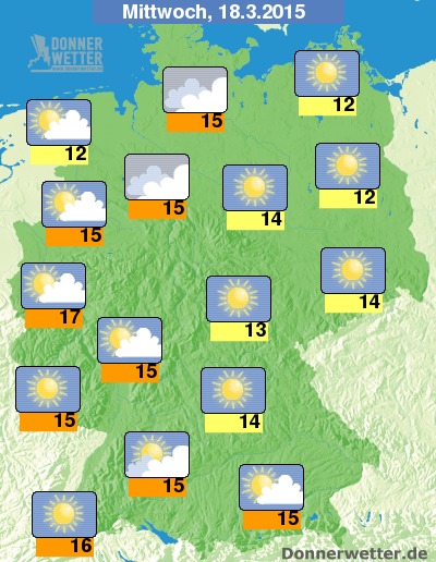 Heute scheint praktisch in der gesamten Osthälfte Deutschlands die Sonne von einem weitgehend wolkenlosen Himmel, auch nach Südwesten hin ist es oft sonnig oder nur locker bewölkt. Im Norden und Westen des Landes können dagegen im Tagesverlauf auch teils dichte Wolken aufziehen, sonst scheint aber auch hier zeitweise die Sonne, dazu bleibt es trocken. Die Höchstwerte erreichen frühlingshafte Werte zwischen 12 Grad in Neubrandenburg und bis 17 Grad im Rheinland.