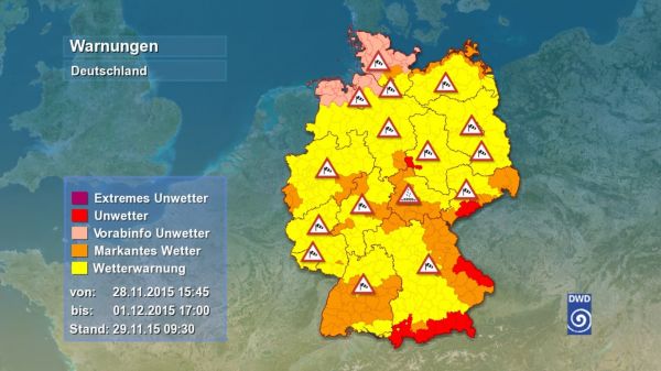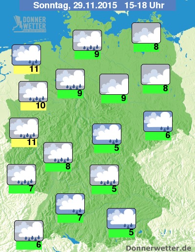 Heute Nachmittag bleibt der Himmel über Deutschland verbreitet bedeckt und es fällt auch immer wieder, teils langanhaltender und kräftiger Regen. Die Temperatur liegt bei 5 Grad in Augsburg und um 11 Grad entlang der Ems. Es weht verbreitet starker bis stürmischer Wind, auf den Bergen und an den Küsten herrscht teils schwerer Sturm.