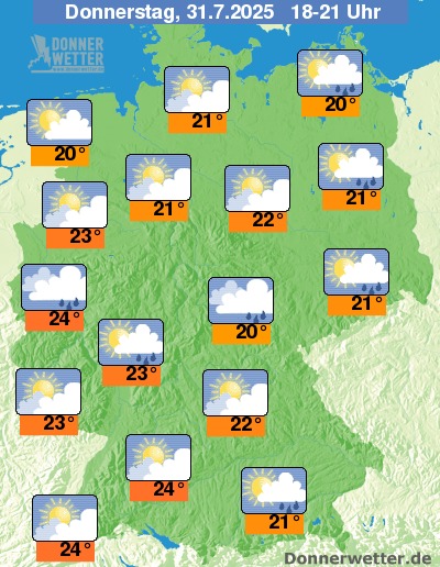 Heute Abend zeigt sich das Wetter weiterhin meist durchwachsen und stark bewölkt. Zwischendurch kann es aber auch auflockern, jedoch bilden sich zeitweise auch Schauer. Die Temperatur liegt bei 20 Grad in Vorpommern und bis 24 Grad im Breisgau.
