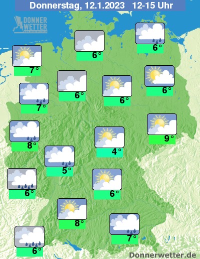 Heute Nachmittag zeigt sich das Wetter überwiegend stark bewölkt oder bedeckt, hier und da kann es aber auch mal auflockern. In den westlichen Landesteilen ziehen kompakte Wolken heran und es setzt verbreitet Regen ein, sonst bleibt es dagegen weitgehend trocken. Die Temperatur liegt bei 4 Grad im Grabfeld und etwa 9 Grad in der Lausitz. An den Küsten ist es teilweise stürmisch.