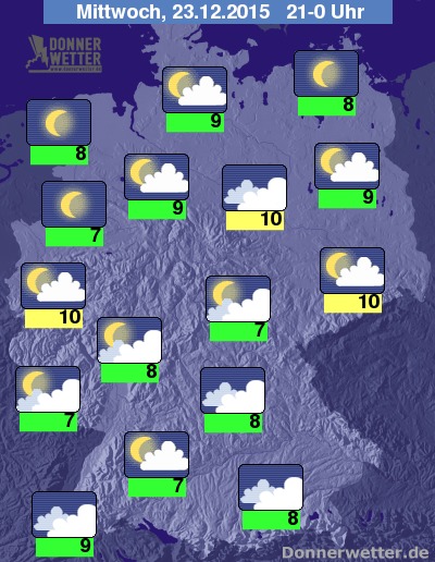 In der Nacht zum Donnerstag klart der Himmel besonders über dem Süden und im Nordosten Deutschlands verbreitet auf, in den anderen Landesteilen zieht meist nur lockere Bewölkung durch, gebietsweise ziehen auch mal dichtere Wolken durch, dabei bleibt es aber trocken. Die Temperatur sinkt auf 7 Grad in Freiburg und bis 4 Grad im Eichsfeld. An der Nordsee weht starker und zum Morgen hin zunehmend auch stürmischer Wind.