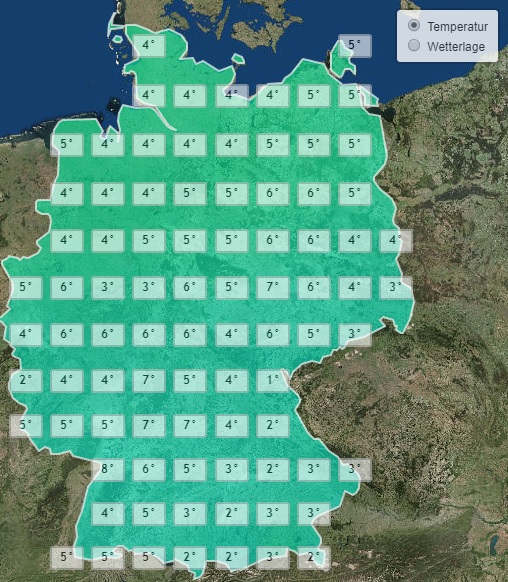 Dazu bleibt es etwas kühler als an den vorangegangenen Tagen. Am Nachmittag pendelt sich das Thermometer landesweit zwischen 6 und 10 Grad ein.