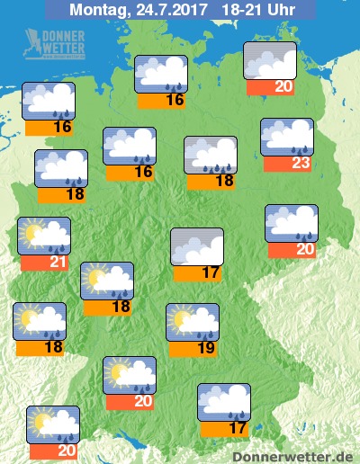 Heute Abend lockert die Bewölkung in den westlichen Landesteilen immer wieder mal auf, es ziehen jedoch auch teils dichte Wolken mit möglichen Schauern und einzelnen Gewittern durch. Im übrigen Bundesgebiet halten sich weitgehend dichte Wolken und es fällt, teils auch langanhaltender Regen. Die Temperatur liegt bei 16 Grad in der Norddeutschen Tiefebene und etwa 23 Grad in Berlin.