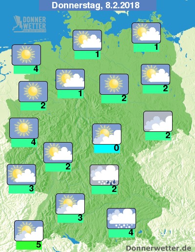 Am Donnerstag halten sich von Bayern bis nach Sachsen dichte Wolken, die hier auch gebietsweise Schnee oder Schneeregen bringen. Über der Nordwesthälfte der Republik ist es hingegen meist heiter bis sonnig und dabei trocken. Im übrigen Bundesgebiet ist es teils aufgelockert, teils auch stark bewölkt, aber weitgehend trocken. Die Temperatur steigt auf 0 bis 5 Grad.