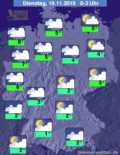 In der Nacht auf Dienstag setzt sich der zum Teil kräftige Regen im Norden und Westen Deutschlands fort, der Himmel ist dabei überwiegend bedeckt. Im Süden und Osten lockern die Wolken im Nachtverlauf zunehmend auf, es ist dann meist locker oder aufgelockert bewölkt, und es bleibt häufig trocken.