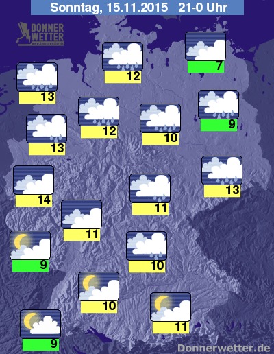 Die Temperaturen liegen am Abend bei Werten um 10 Grad C an der Ostseeküste und 14 Grad C im Rheinland.