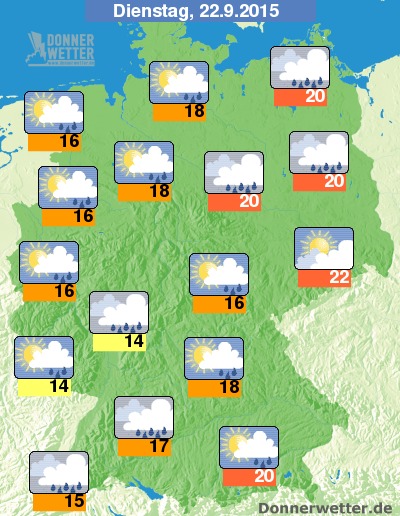 Am Dienstag ziehen immer wieder dichte Wolken übers Land und es fällt dabei zeitweise Regen, zwischendurch kann die Bewölkung aber auch mal aufheitern und der Sonne Platz machen. Im Norden und Westen Deutschlands können sich zudem auch einzelne, meist kurze Gewitter bilden. Die Temperatur steigt auf 14 Grad im Bliesgau und bis 22 Grad in Dresden.