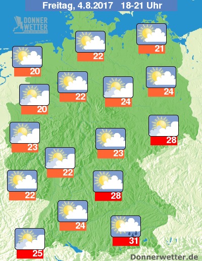 Heute Abend bilden sich am Alpenrand sowie im Bayerischen Wald gebietsweise Schauer oder Gewitter. Im übrigen Bundesgebiet ist es zum Großteil heiter bis wechselnd bewölkt, vor allem im Nordwesten auch stark bewölkt, dabei bleibt es weitgehend trocken. Die Temperatur liegt bei 20 Grad an der Ems und bis 31 Grad in München.