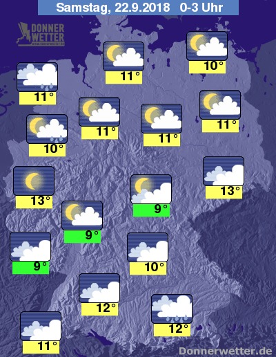 In der Nacht sowie in den frühen Morgenstunden zeigt sich der Himmel über der Nordhälfte zumeist locker bewölkt. Einzelne Schauer können zunächst noch im äußersten Nordwesten fallen, sonst bleibt es trocken. Im Süden dominieren zunächst dichte Wolken, im Nachtverlauf lockert es dann aber auch verbreitet auf. Bis auf einzelne Schauer im Alpenvorland bleibt es auch hier meist trocken.