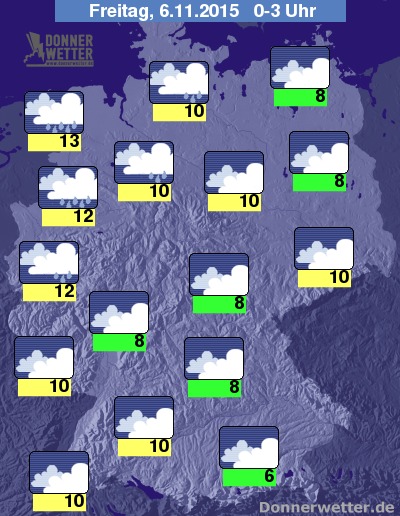 Im Rest der Republik bleibt es bei zunächst überwiegend lockerer Bewölkung trocken. In den frühen Morgenstunden des Freitag nimmt die Bewölkung dann aber vielerorts zu, die Temperaturen liegen dann bei Werten um 13 Grad C im Emden und um 6 Grad C am Alpenrand.