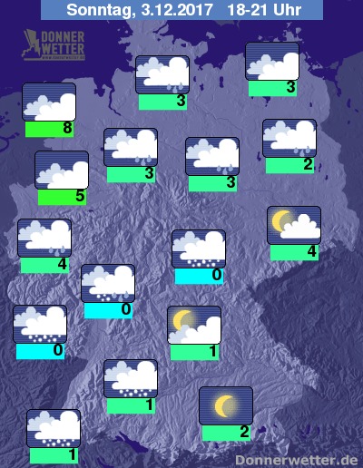 In der Nacht zum Montag fällt im Süden bei dichten Wolken verbreitet Schnee, dazu ist es häufig glatt! Weiter nach Norden hin halten sich zwar meist dichte Wolken, Regen oder Schnee fällt dazu jedoch nur selten. Die Temperatur sinkt auf 7 Grad an der Nordsee und bis -2 Grad am Alpenrand.