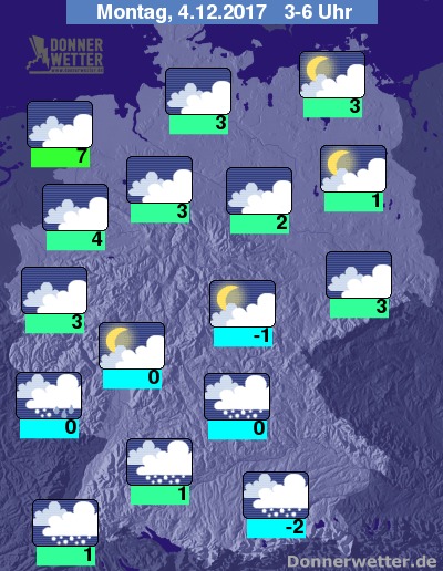 Am Montag bleibt es überwiegend bei dichten Wolken, Auflockerungen sind vor allem an der Ostsee, hier und da aber auch im Westen und Nordwesten mal möglich, hier bleibt es auch die meiste Zeit trocken, sonst fällt dagegen zeitweise Regen, nach Süden hin meist Schneeregen oder Schnee. Die Temperatur erreicht 2 Grad in Mittelfranken und bis 9 Grad in Wilhelmshaven.