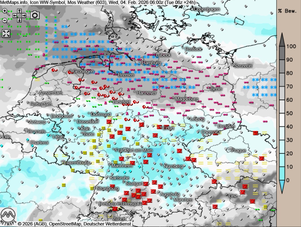 Die Wetter- und Temperaturkarte für Mittwochfrüh (06:00 Uhr) nach ICON: