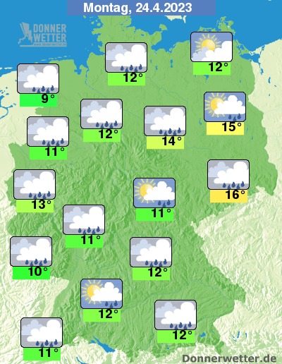 Am Montag zieht wechselnde, überwiegend allerdings starke Bewölkung durch, dabei bilden sich gebietsweise Schauer, ganz vereinzelt sind auch Gewitter möglich. Die Temperatur steigt auf sehr frische 9 Grad an der Nordsee und bis 16 Grad in der Lausitz.