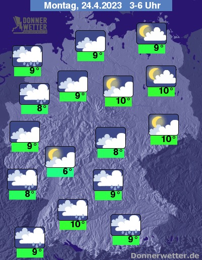 In der Nacht zum Montag ist es über dem Süden, Südwesten, Westen und Nordwesten meist bedeckt und es fällt dazu zeitweise Regen. Weiter nach Nordosten hin ist es teils aufgelockert, teils stark bewölkt, dazu bleibt es meist trocken. Die Temperatur sinkt auf 10 Grad an der Oder und bis 6 Grad am Westerwald.