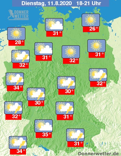 Am frühen Abend liegen die Temperaturen zwischen schweißtreibenden 30 und 36 Grad, etwas angenehmer bleibt es an den Küsten, sowie auf den Gipfeln der Mittelgebirge.