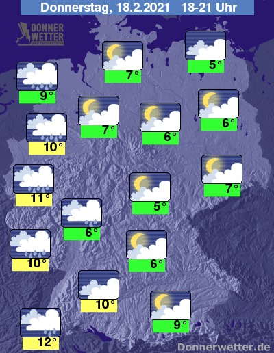 Heute Abend fällt vom Emsland bis zum Bodensee verbreitet Regen, östlich dieser Linie ist es dagegen noch teils aufgelockert, teils auch schon stark bewölkt, jedoch noch trocken. Die Temperatur liegt bei 5 Grad in Erfurt und bis 12 Grad in Freiburg.