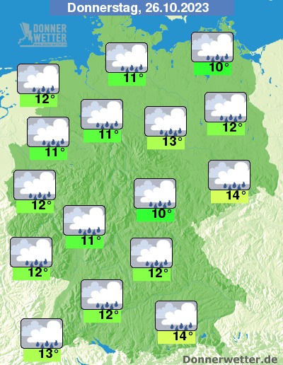 Am Donnerstag bleibt es den Tag über stark bewölkt oder bedeckt und es fällt zeitweise, örtlich auch kräftiger Regen. Die Temperatur steigt auf 10 Grad in Neubrandenburg und 14 Grad in München.