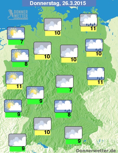Heute halten sich besonders in der Osthälfte Deutschlands oft dichte Wolken und es regnet anfangs noch häufig, der Regen zieht sich im Tagesverlauf jedoch immer weiter nach Osten und Nordosten zurück. Sonst ist es zunächst verbreitet aufgelockert bis stark bewölkt und trocken. Am Nachmittag ziehen aus Westen erneut dichte Wolken und nachfolgend Regen auf, der bis zum Abend etwa die Westhälfte des Landes umfasst haben wird. In der Osthälfte des Landes bleibt es etwa ab den Abendstunden trocken und teils kann die Bewölkung auch etwas auflockern. Die Höchstwerte erreichen 7 Grad im Coburger Land und bis 11 Grad im Rheinland.