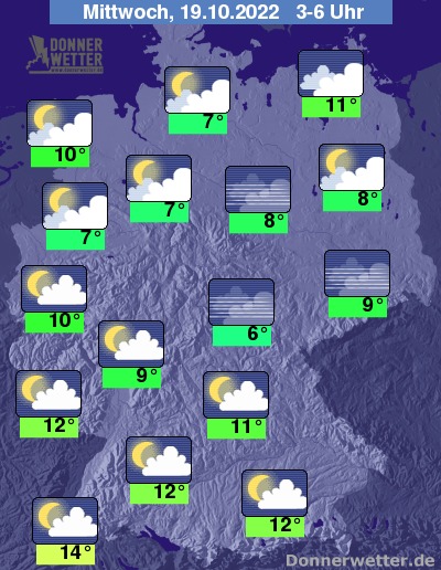 In der Nacht zum Mittwoch ziehen vor allem im Norden oft einige, teils dichte Wolken durch, sonst ist es jedoch überwiegend locker bewölkt und zum Teil auch sternenklar. Bei Tiefstwerten von 14 Grad in Freiburg und 6 Grad in Jena bleibt es trocken.
