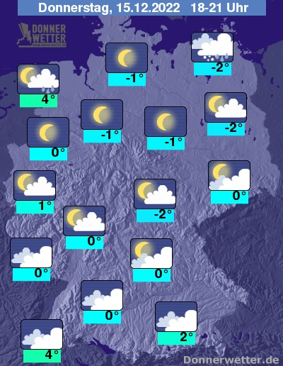 Heute Abend ist der Himmel vor allem im Norden verbreitet sternenklar. Im Umfeld der Küsten können dichte Wolken zum Teil Schnee, Schneeregen oder auch gefrierenden Regen bringen. Auch im Alpenvorland ist bei dichter Bewölkung Schnee, Schneeregen oder auch gefrierender Regen möglich. Es besteht erhöhte Glättegefahr!  Im übrigen Land ist es teils locker, teils stark bewölkt und dazu trocken. Die Temperatur liegt bei -2 Grad in Berlin und 4 Grad in Freiburg.