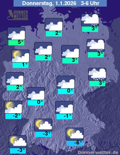 Am Donnerstag bleibt es südlich des Mains oft heiter oder sogar sonnig, hier bleibt es trocken. Im übrigen Bundesgebiet ist es zumeist bedeckt, dabei fällt zeitweise Schnee oder Schneeregen, besonders im Norden eher Regen oder Schneeregen. Die Temperatur steigt auf 0 Grad in Erfurt und bis 6 Grad in Cuxhaven. Über der Nordhälfte ist es oft stürmisch, an der See herrscht verbreitet Sturm.