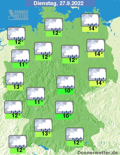 Heute ziehen überwiegend dichte Wolken durch, kurze Auflockerungen bleiben eher selten, stattdessen bilden sich wiederholt Schauer. Die Temperatur steigt auf 10 Grad in Nürnberg und bis 14 Grad in Berlin.