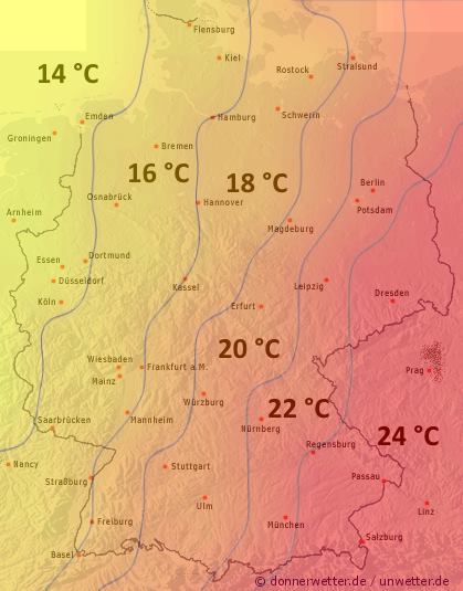 Am weiteren Tagesverlauf ändert sich nicht wirklich viel am Wetter. Zunächst bleib es in den meisten Regionen trocken, zeitweise mit Sonnenschein. Allerdings ziehen über dem Emsland Schauerwolken her. Die Temperturen steigen nochmal leicht an auf Werte um 17 Grad C bis 22 Grad C. Im Südwesten am Rhein sind auch 23 bis 25 Grad C, lokal sogar 26 Grad C möglich.
