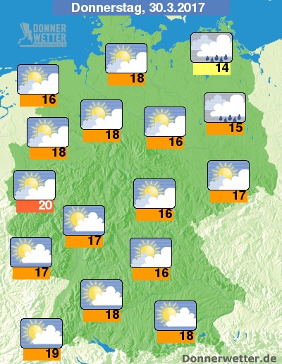 Am Donnerstag zeigt sich das Wetter meist heiter über der Bundesrepublik. Ausgenommen sind die Regionen der Ostseeküste und unsere Hauptstadt Berlin. Dort wird es am Donnerstag weitgehend den größten teil des Tages regnen. Die Temperaturen zegien sich dennoch mit 14 Grad C zufriedenstellend. Die Höchsttemperaturen am Donnerstag liegt bei 20 Gard C im Wetsfalenland.