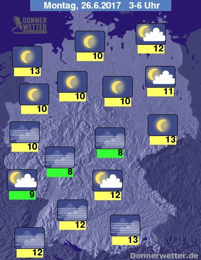 In der folgenden Nacht sind über dem Ostseeumfeld und im Süden gebeitsweise lockere Wolkenfelder unterwegs, sonst ist es hingegen mehrheitlich sternenklar, dazu bleibt es trocken. Die Temperatur sinkt auf 13 Grad in Dresden und bis 8 Grad am Taunus.