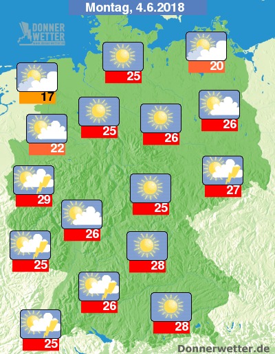 Zum Wochenstart scheint über Deutschland wieder verbreitet die Sonne und es ist zum Großteil dazu wolkenlos oder nur locker bewölkt. Im Einzugsgebiet von Ober- und Mittelrhein sowie dem Erzgebirge können sich im Tagesverlauf jedoch Schauer und auch Gewitter entwickeln, sonst bleibt es verbreitet trocken. Im Umfeld der Nordsee halten sich allerdings auch am Nachmittag noch oft dichtere Wolken. Die Temperatur steigt hier nur auf 17 Grad, sonst auf 20 Grad an der Ostsee und bis 29 Grad in Köln.