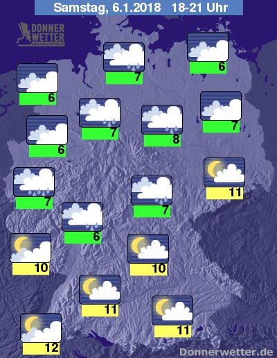 Heute Abend überzieht ein breiten Regenband mit dichten Wolken und teils langanhaltendem Regen etwa die Nordhälfte des Landes. Südlich des Mains ist es meist nur locker bis aufgelockert bewölkt und dazu trocken. Im Küstenumfeld bleibt es bei dichten Wolken weitgehend trocken. Die Temperatur liegt bei milden 6 bis 12 Grad.