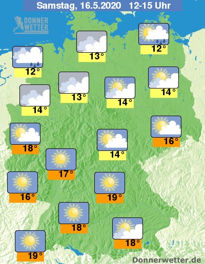 Im Nachmittagsverlauf verdichten sich die Wolken über dem Norden des Landes, vor allem im Küstenumfeld muss dabei auch zeitweise mit Schauern gerechnet werden. Im Süden Deutschlands ist es teils heiter bis wolkig, teils scheint die Sonne von einem wolkenlosen Himmel.