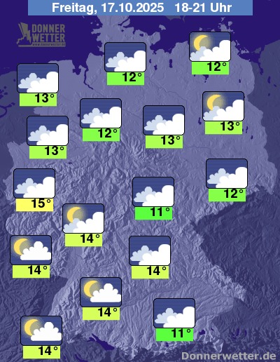 Heute Abend ziehen viele und zumeist auch dichte Wolken durch, lediglich im Südwesten ist der Himmel oft nur locker bewölkt. Im Nordosten ist es gebietsweise aufgelockert bewölkt. Es bleibt bis auf seltene Schauer über der Nordhälfte des Landes trocken. Die Temperatur liegt bei 11 Grad in Jena und 15 Grad in Bonn.