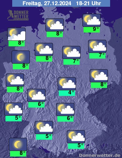 Heute Abend ist es über Deutschland verbreitet nur locker bewölkt und oft zeigt sich der Himmel sogar sternenklar. Mehr Wolken sind jedoch in Küstennähe möglich, jedoch bleibt es auch hie trocken. Die Temperatur liegt bei 4 Grad in Jena und rund 9 Grad in Neubrandenburg.