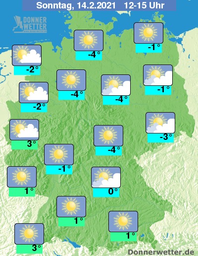 Heute Nachmittag zeigt sich das Wetter verbreitet heiter bis sonnig, hier und da können aber auch einige Wolken durchziehen, dabei bleibt es trocken. Die Temperatur steigt auf -4 Grad in Magdeburg und bis 3 Grad in Köln und Freiburg.