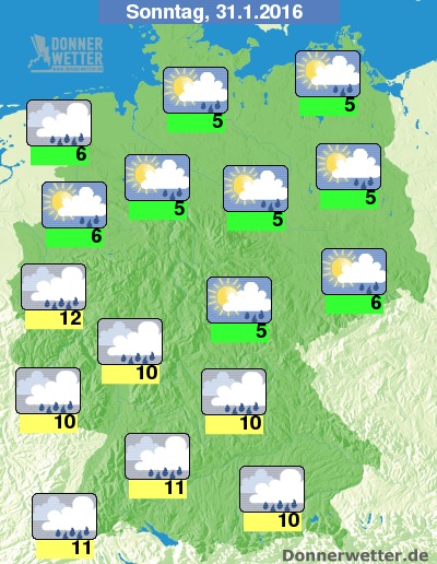 Am Sonntag ist es zunächst im Süden dicht bewölkt und es fällt zum Teil kräftiger Regen, im Tagesverlauf breiten sich die dichten Wolken und der Regen weiter nach Nordosten hin aus, vorher ist es dagegen noch wechselnd, zunehmend allerdings stark bewölkt, an der Ostsee bleibt es bis zum Abend hin noch meist trocken. Die Temperatur steigt auf 4 Grad in Oberfranken und bis 12 Grad in Aachen. Im Norden weht ein teils starker Wind.