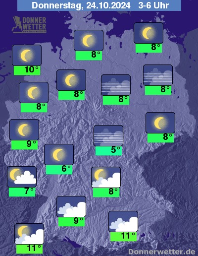 In der Nacht zum Donnerstag klingen auch die letzten Niederschläge am Alpenrand ab, jedoch bleibt es im Süden meist trüb und vielerorts kann sich auch Nebel oder Hochnebel bilden. Weiter nach Norden ist es dagegen verbreitet sternenklar, dazu bleibt es natürlich trocken. Die Temperatur sinkt auf 11 Grad in Freiburg und bis 5 Grad in Jena.