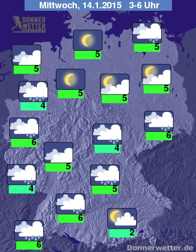 In der Nacht zum Mittwoch ist es häufig stark bewölkt oder bedeckt und es fällt vor allem im Süden und Westen, gebietsweise aber auch im Norden und Osten, Regen. Besonders im Norden kann die Bewölkung aber auch längere Zeit auflockern, teils wird es klar. Die Temperatur sinkt auf 6 Grad in Stuttgart und etwa 2 Grad in München. Der Wind weht weiterhin oft frisch bis stark und in Böen zum Teil stürmisch, dabei sind Sturmböen möglich. In den Bergen und an der See ist es häufig stürmisch, dazu können auch schwere Sturmböen und vereinzelt orkanartige Böen auftreten.