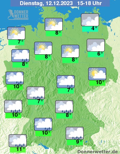 Heute Nachmittag zeigt sich der Himmel bis auf einzelne Auflockerungen, vorwiegend in der Nordhälfte, stark bewölkt oder es ist bedeckt. Zunächst muss am Nachmittag im Süden und Westen immer wieder mit Regenfällen gerechnet werden, im Süden auch ergiebiger Regen. Am Abend erreichen die Niederschläge dann auch den Nordwesten und Südosten Deutschlands.