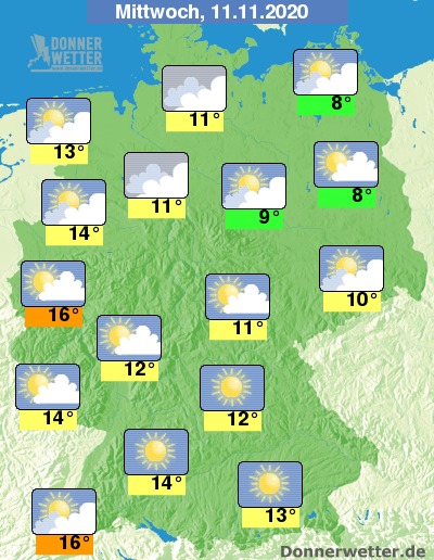 Die Höchsttemperaturen erreichen Werte zwischen 8 Grad im Nordosten und 16 Grad im Breisgau, sowie in der Kölner Bucht. Im Dauergrau bleibt es feucht-kühl.