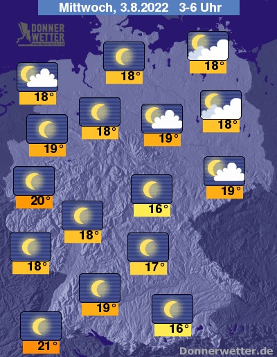 In der kommenden Nacht ist es anfangs hier und da noch locker bis aufgelockert bewölkt, jedoch klart es im Laufe der Nacht überall auf und dann funkeln verbreitet die Sterne. Es bleibt bundesweit trocken bei Tiefstwerten von 21 Grad in Freiburg und etwa 16 Grad in Jena.