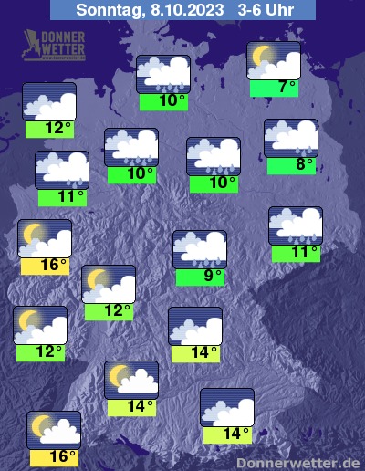 In der Nacht zum Sonntag ziehen dichte Regenwolken vom Norden bis etwa in die Mitte des Landes und in den Osten. Im Süden und Westen ist es noch oft locker, teils auch schon stark bewölkt, aber weitgehend trocken. Die Temperatur sinkt auf 16 Grad in Köln und 7 Grad in Rostock.