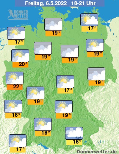 Heute Abend ist es oft heiter bis aufgelockert bewölkt, zum Teil aber auch stark bewölkt. An den Alpen und über der Südhälfte Bayerns bleibt es bei dichten Wolken und es fällt gebietsweise auch Regen. Im übrigen Land bleibt es trocken bei Werten von 16 Grad in München und 22 Grad in Köln.