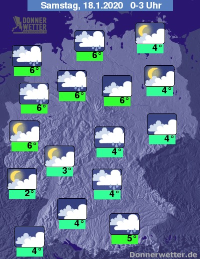 In der Nacht zeigt sich der Himmel verbreitet bedeckt, Auflockerungen beschränken sich in den kommenden Stunden vor allem auf den Südwesten und Nordosten des Landes. Westlich der Weser sowie im Südosten fallen in der Nacht zeitweise Niederschläge, an den Alpen auch Schnee. Die Schneefallgrenze sinkt auf 600 bis 700m. In den übrigen Landesteilen bleibt es meist trocken.