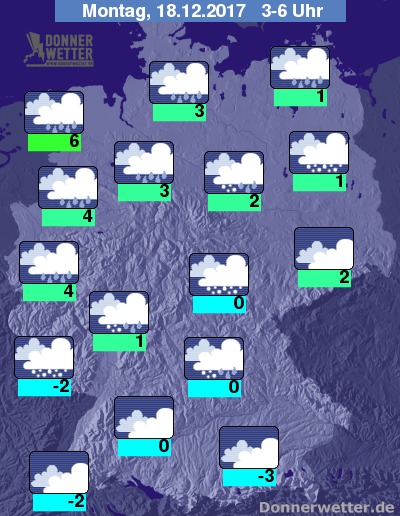 In der kommenden Nacht ziehen kompakte Wolken mit teils kräftigem Regen, Schneeregen oder Schnee von Nordwest nach Südost. Besonders im Süden und Osten besteht bei Ankunft des Tiefausläufers verbreitet Glättegefahr, in der ersten Nachthälfte bleibt es hier jedoch noch weitgehend trocken. Die Temperatur sinkt auf 6 Grad in Cuxhaven und bis -3 Grad im Umland von München.