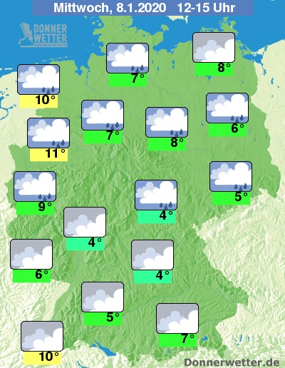 Bis zum frühen Abend ändert sich an den Bewölkungs- und Temperaturverhältnissen recht wenig. Der Regen legt jedoch gebietsweise größere Pausen ein