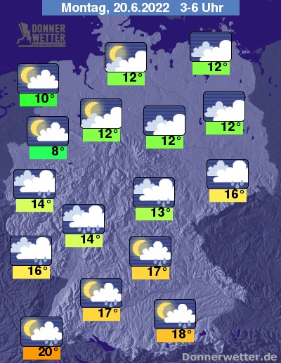 Am Montag ziehen vor allem vormittags noch gebietsweise dichte Wolken durch und es bilden sich mögliche Schauer und Gewitter. Vor allem am Nachmittag ist es aber verbreitet auch heiter bis sonnig und trocken. Die Temperatur steigt auf 18 Grad an der Nordsee und bis 32 Grad am Oberrhein.